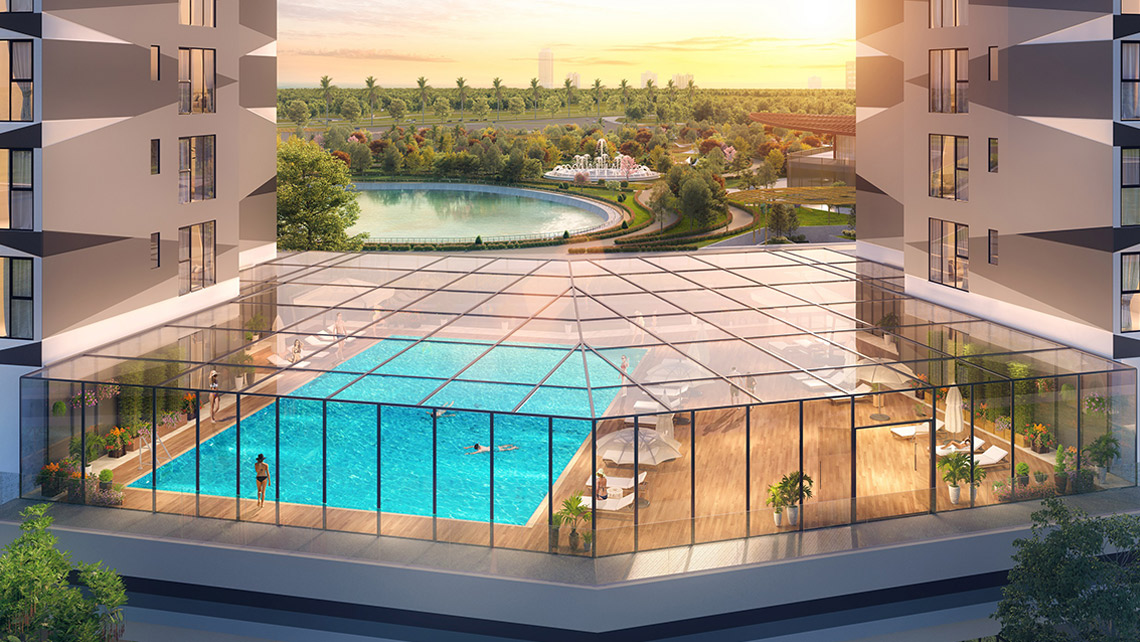 Tận hưởng đặc quyền thư giãn độc nhất trong không gian xanh dương vô tận trải dài nơi bể bơi giữa tầng không tại cầu nối hai toà tháp với thiết kế mái kính trong và tầm nhìn tuyệt mỹ ra công viên cảnh quan The Matrix Park 14ha.